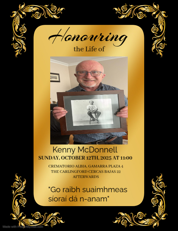 Please feel welcome to join us in remembering his life in an informal event at Crematorio Albia, followed by an even more informal event at Kenny’s favourite watering hole - The Carlingford Pub